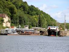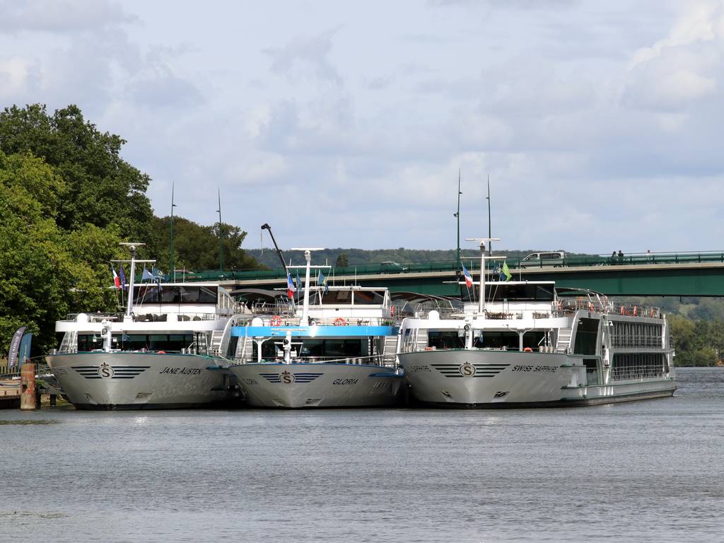 Gaillard aux Andelys, trois bateaux de croisière sont amarrés.
